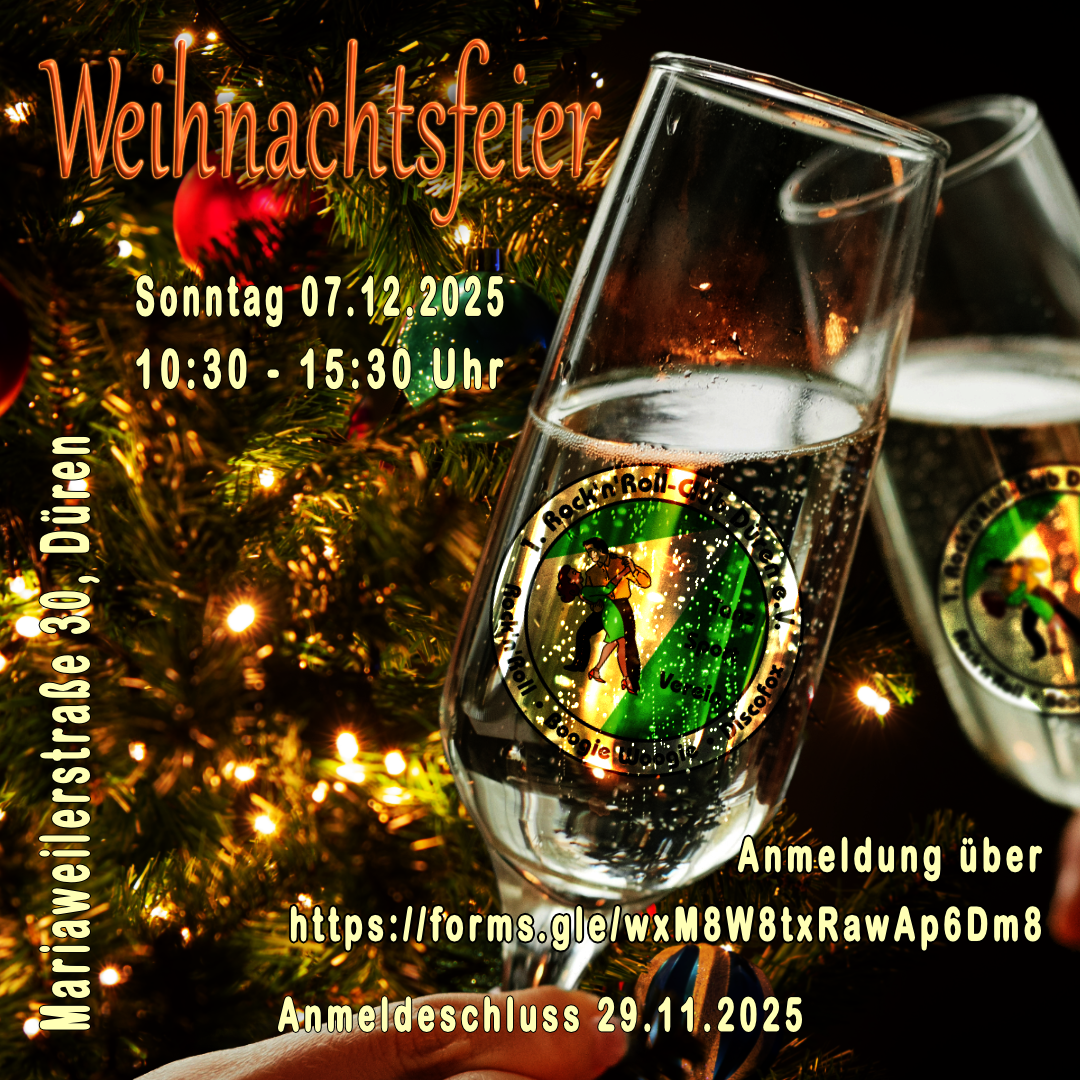 Wir laden euch zur jährlichen Weihnachtsfeier unseres Vereins am Sonntag, 07.12.2025 ab 10:30 Uhr in unser Vereinsheim ein. Wir wollen mit euch das Jahr 2025 Revue passieren lassen, zusammen zu weihnachtlichen Klängen etwas tanzen, ein paar Mitglieder ehren, uns unterhalten und selbstverständlich den üblichen Brunch genießen!